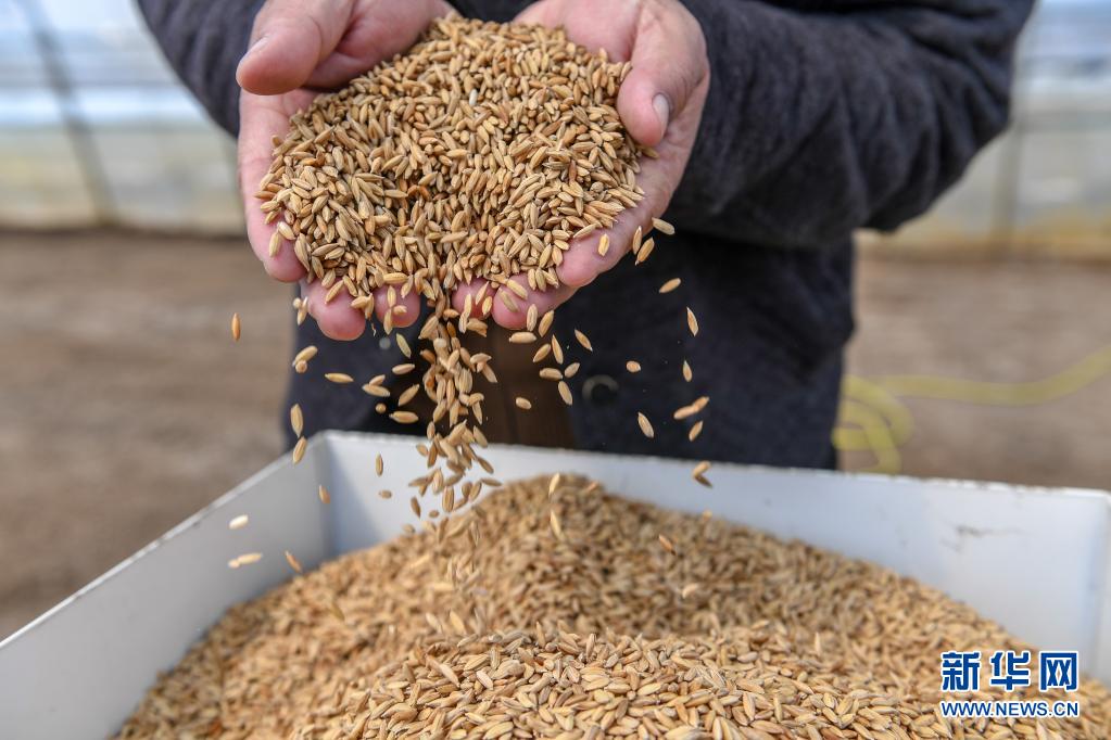 在吉林省吉林市永吉县九月丰家庭农场,负责人肖建波将水稻种子倒入育秧机(4月13日摄)。新华社记者 张楠 摄