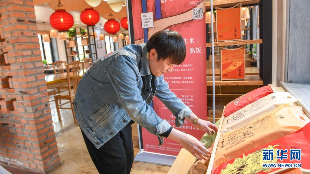 在吉林市船营区大绥河镇,创业者曹曦将农场生产的大米摆在民宿显眼位置进行展示(4月20日摄)。新华社记者 张楠 摄