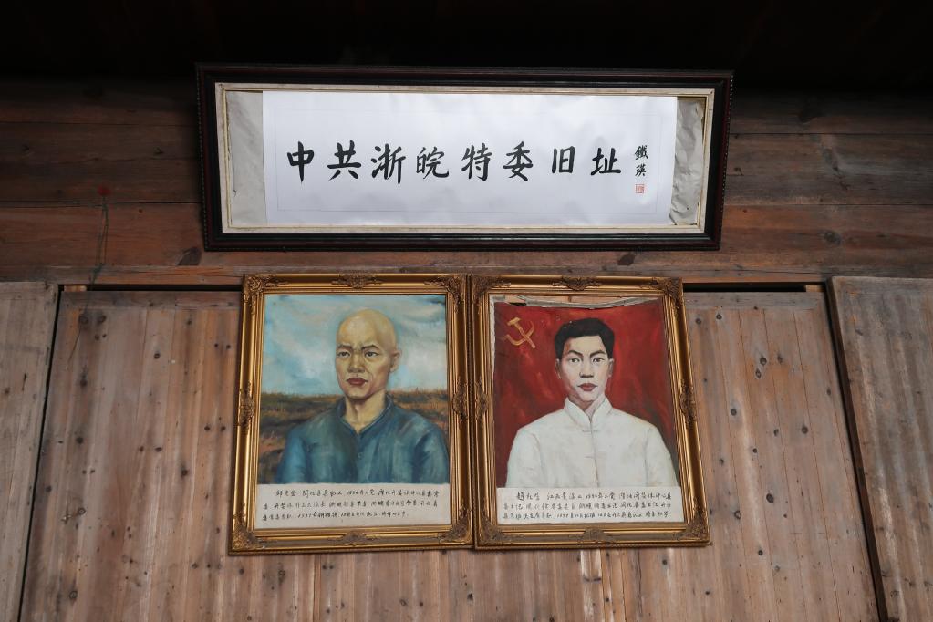 木结构老宅坐西朝东,面阔三间,墙上“红军政宣”字迹依然清晰可辨。走进厅堂,正上方挂着浙江省委原书记铁瑛所书“中共浙皖特委旧址”牌匾,下方悬挂着赵礼生和邱老金两位革命先烈的画像。