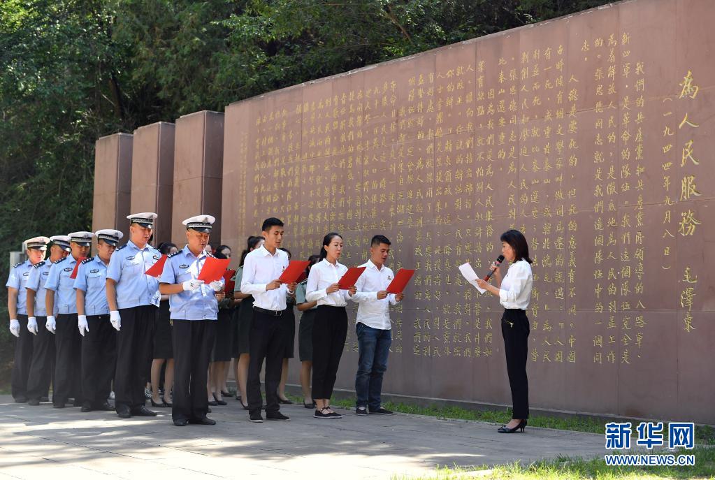 党员干部在延安《为人民服务》讲话纪念广场诵读《为人民服务》。新华社记者 张博文 摄