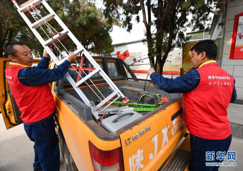 3月30日,国网延安供电公司枣园供电所张思德服务队队员王栋(左)、郝李军准备出发执行抢修任务。新华社记者 张博文 摄
