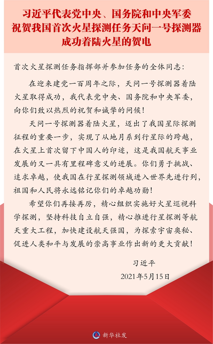 在迎来建党一百周年之际,天问一号探测器着陆火星取得成功,我代表党中央、国务院和中央军委,向你们致以热烈的祝贺和诚挚的问候!