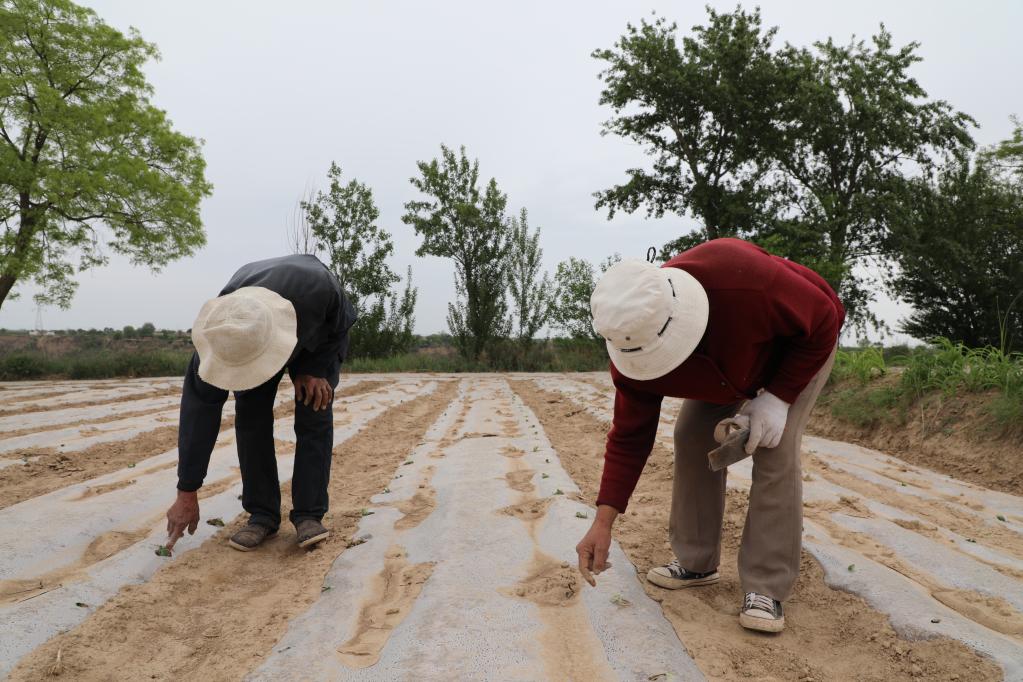 李海俭的父母弯下腰,正在戳破地膜,让幼苗探出“脑袋”。新华社记者 李杰摄