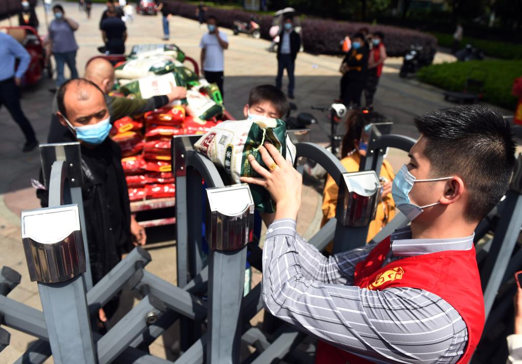 5月17日,在裕安区恒大御景湾小区,志愿者(下)将采购的大米递给小区居民。新华社记者周牧 摄