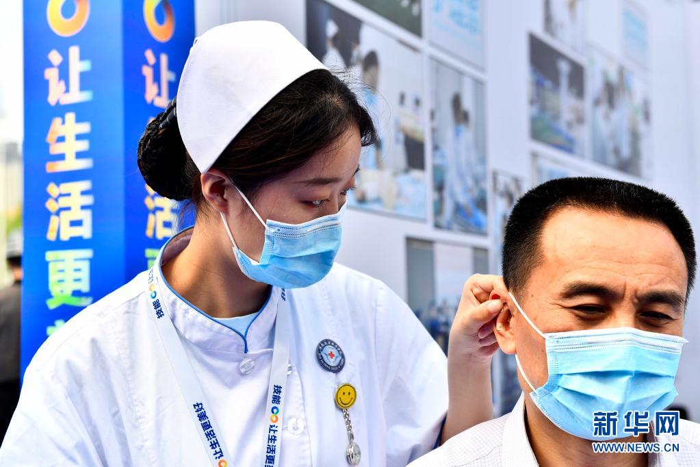 5月20日,在山东国际会展中心,济南护理职业学院学生进行耳穴压豆技能展示。当日,以“技能:让生活更美好”为主题的2021年职业教育活动周全国启动仪式暨全国职业院校技能大赛开幕式在山东济南举行。据悉,本次活动以职业院校学生为主体,重点突出“技能成就出彩人生”“技能服务美好生活”“技能支撑强国战略”等内容。 新华社记者 郭绪雷 摄