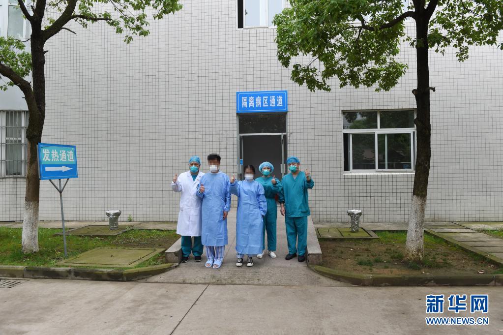 5月20日,在安徽省六安市人民医院东院区,解除医学隔离观察的无症状感染者(左二)和出院的新冠肺炎确诊患者(左三)走出隔离病区后和医护人员合影。新华社记者 周牧 摄