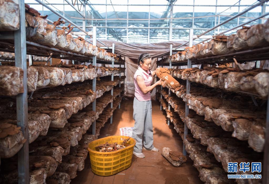 在湖北省十堰市郧阳区青龙泉社区香菇产业基地,易地扶贫搬迁户在大棚中忙碌(2020年8月28日摄)。新华社记者 肖艺九 摄