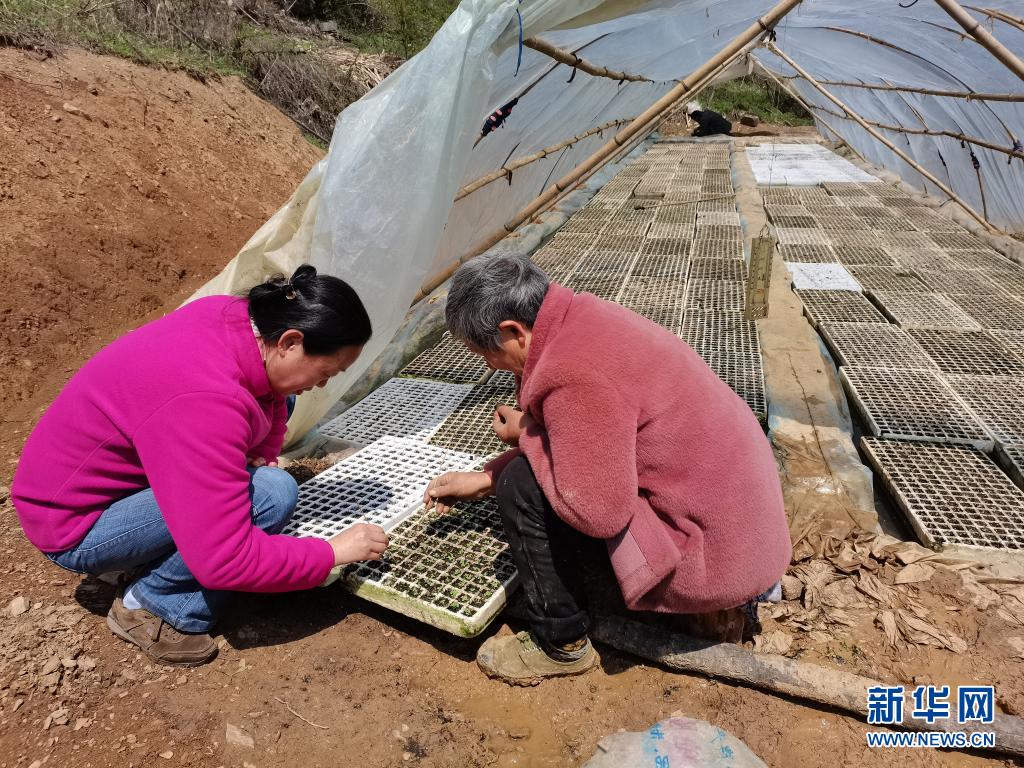 4月8日,汉江师范学院副教授金梅(左)在竹山县柳林乡公祖村入户查看村民家的大棚育苗情况。新华社发