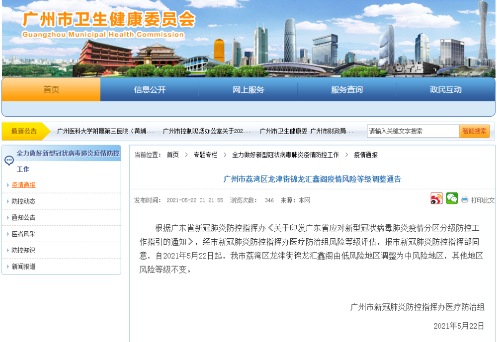 根据广东省新冠肺炎防控指挥办《关于印发广东省应对新型冠状病毒肺炎疫情分区分级防控工作指引的通知》,经市新冠肺炎防控指挥办医疗防治组风险等级评估,报市新冠肺炎防控指挥部同意,自2021年5月22日起,我市荔湾区龙津街锦龙汇鑫阁由低风险地区调整为中风险地区,其他地区风险等级不变。