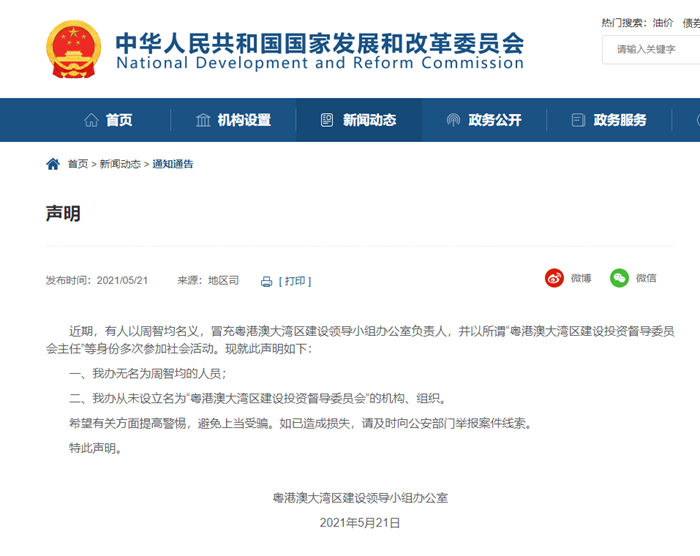 “国家发展改革委”官方网站5月21日发布了粤港澳大湾区建设领导小组办公室的一则《声明》:近期,有人以周智均名义,冒充粤港澳大湾区建设领导小组办公室负责人,并以所谓“粤港澳大湾区建设投资督导委员会主任”等身份多次参加社会活动。