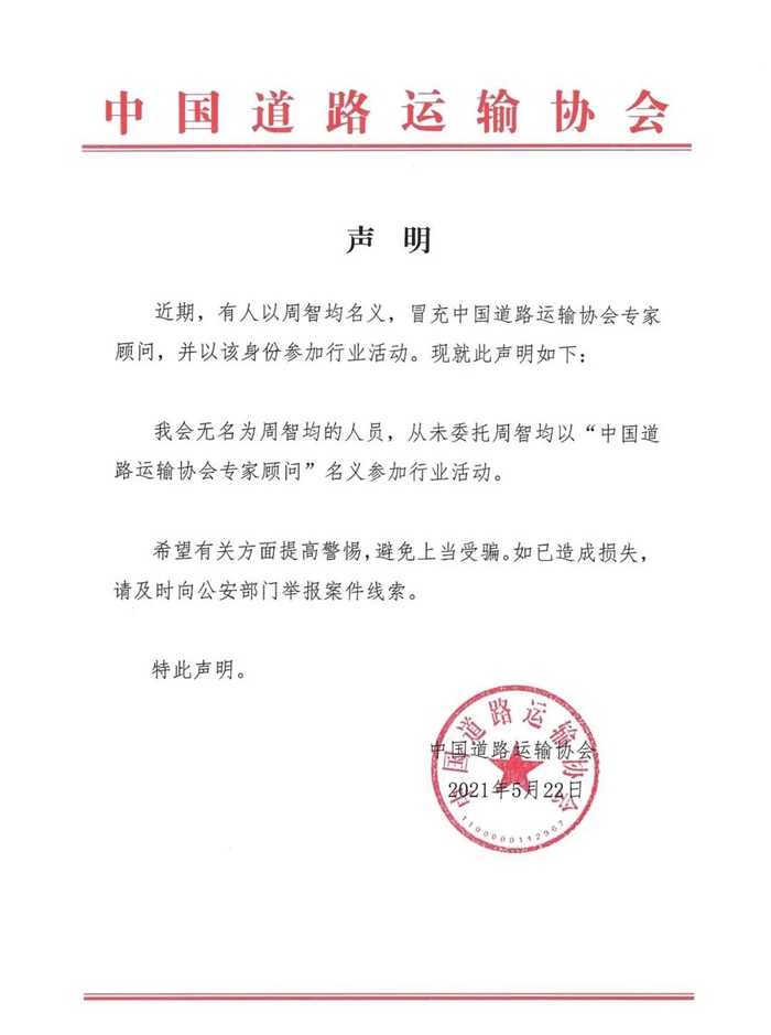 声明明确指出:我会无名为周智均的人员,从未委托周智均以“中国道路运输协会专家顾问”名义参加行业活动,并提醒有关方面提高警惕。