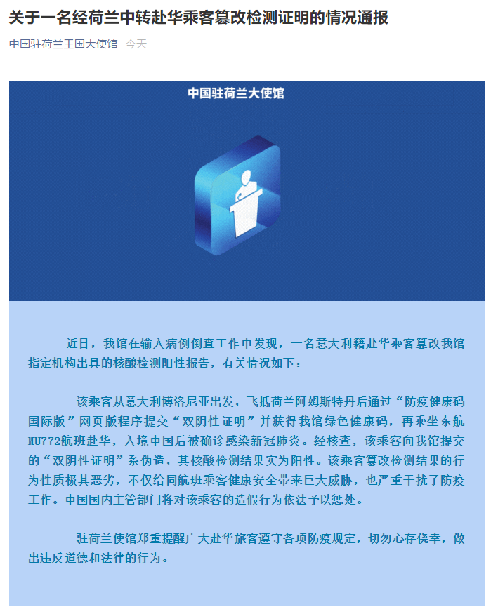 关于一名经荷兰中转赴华乘客篡改检测证明的情况通报