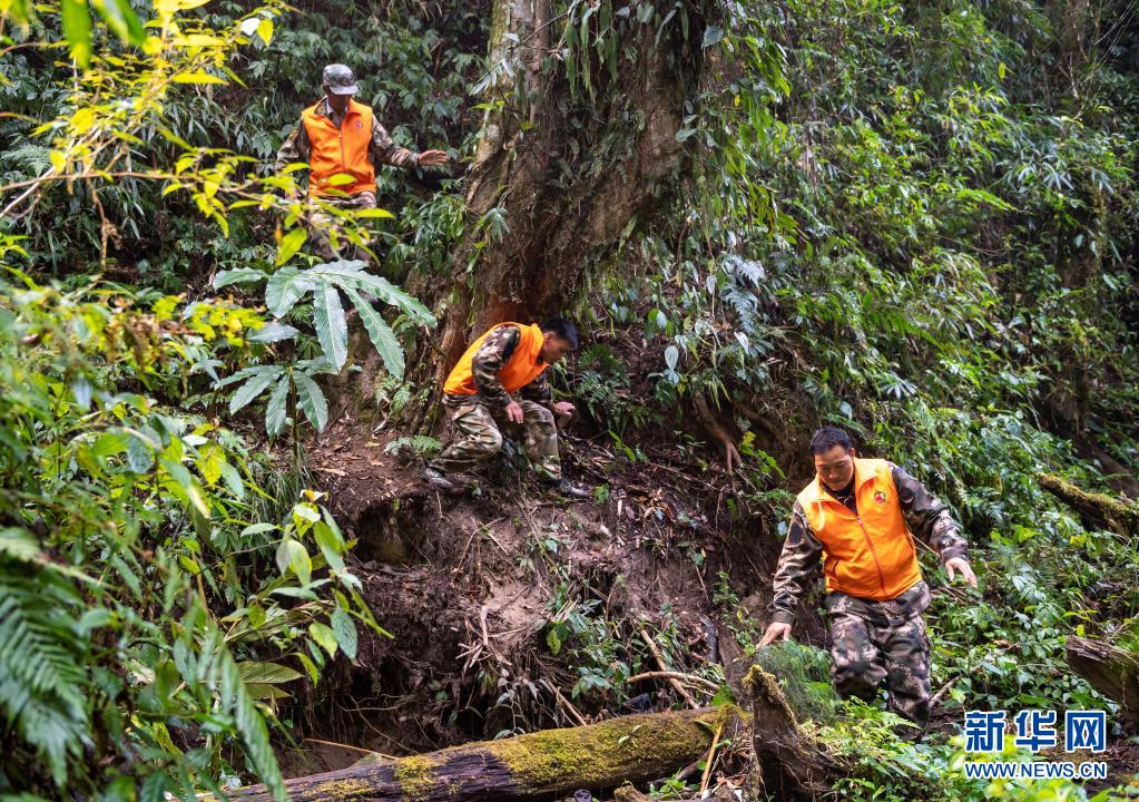 护林员杨有山(右一)和同事在布设红外相机(3月15日摄)。新华社记者 陈欣波 摄