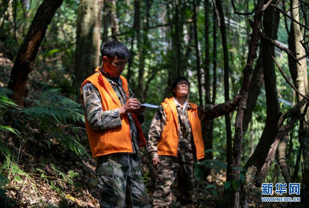 护林员杨有山(左)在林间记录天行长臂猿家庭的活动情况(3月15日摄)。新华社记者 陈欣波 摄