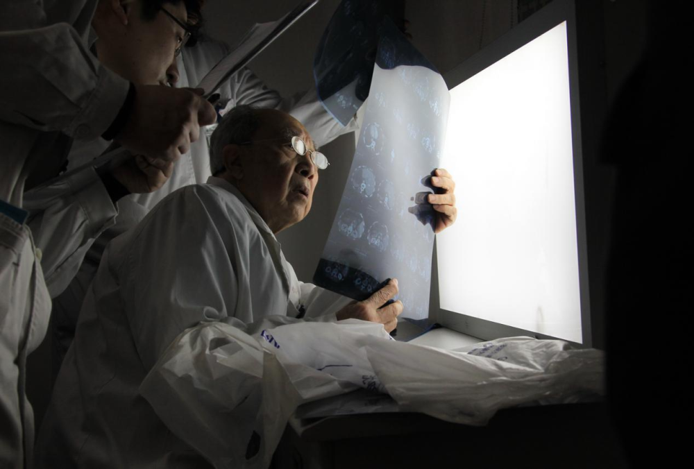 ↑吴孟超带着学生仔细诊断患者病情,确定手术方案。王建民摄