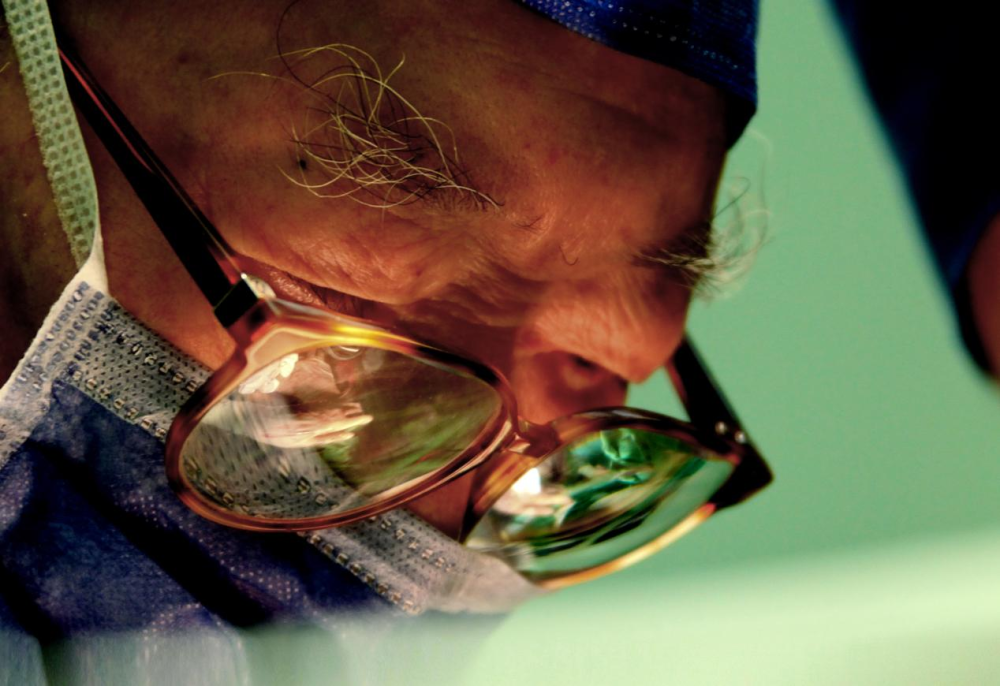 ↑89岁高龄的吴孟超戴着高度老花镜,手头却灵巧自如,出神入化。王建民摄