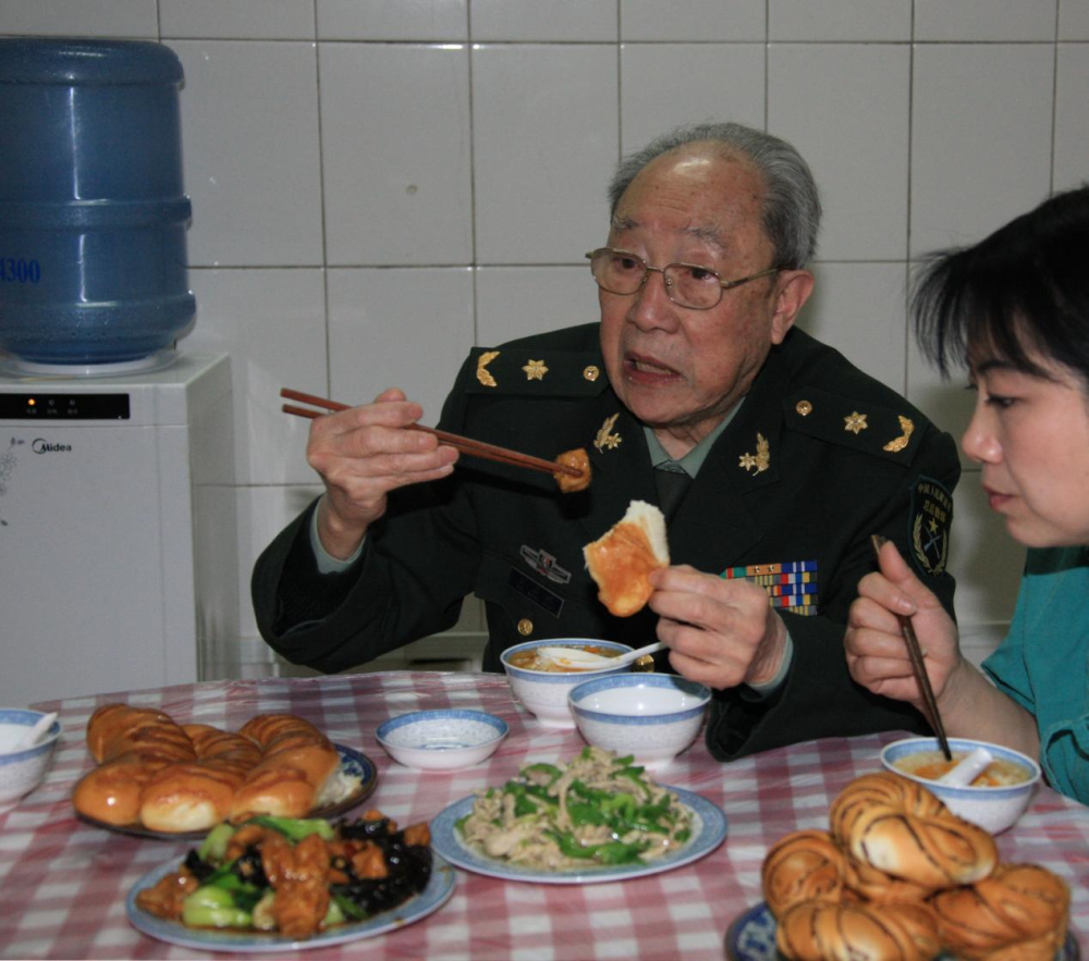 ↑吴孟超在医院食堂吃午餐,他喜欢吃面包,有时一天三顿都吃面包。王建民摄