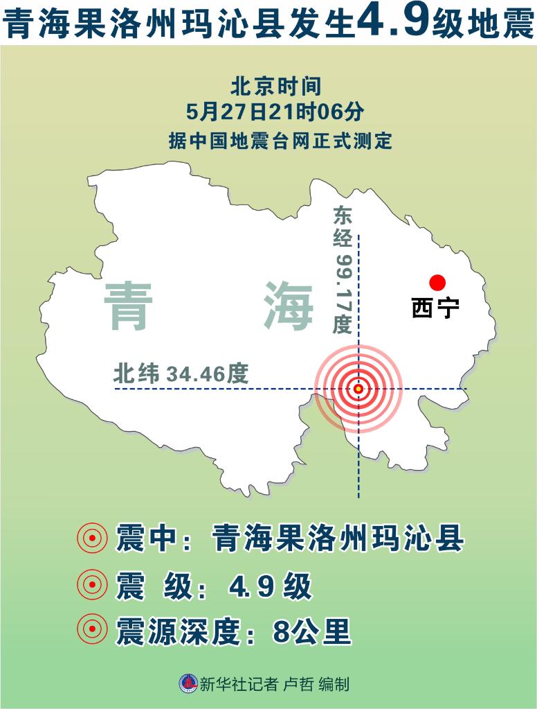 中国地震台网正式测定:05月27日21时06分在青海果洛州玛沁县(北纬34.46度,东经99.17度)发生4.9级地震,震源深度8千米。