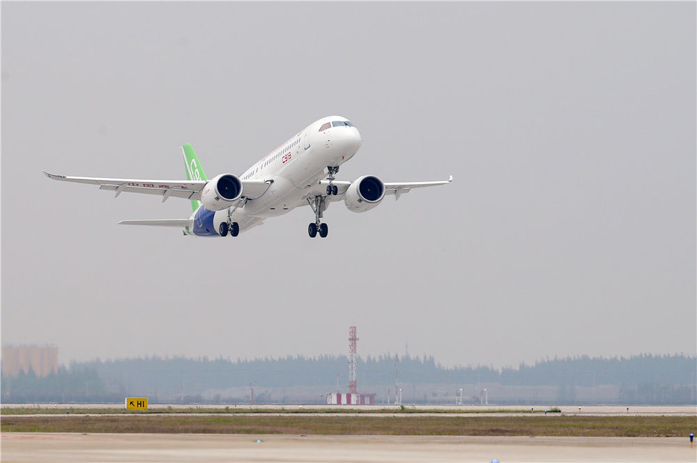 2017年5月5日,国产大型客机C919在上海浦东国际机场首飞成功。新华社记者 丁汀 摄