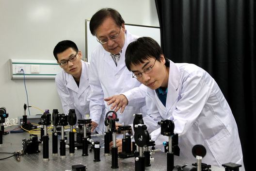 2012年5月,姚期智指导清华学生做实验。(清华大学供图)