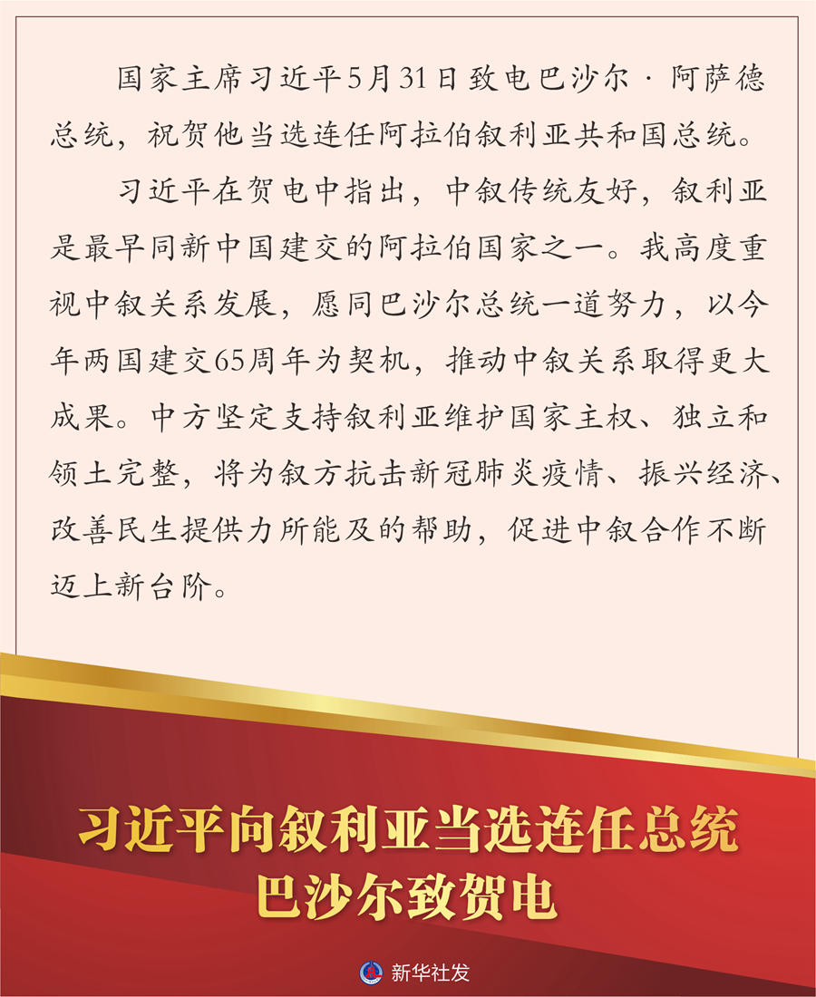 新华社北京6月1日电 国家主席习近平5月31日致电巴沙尔·阿萨德总统,祝贺他当选连任阿拉伯叙利亚共和国总统。