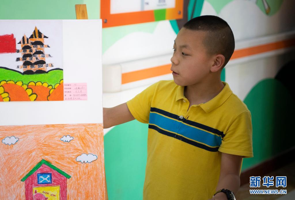 在山西太原市社会(儿童)福利院,吴贞男在介绍他的画作(5月26日摄)。新华社记者 杨晨光 摄