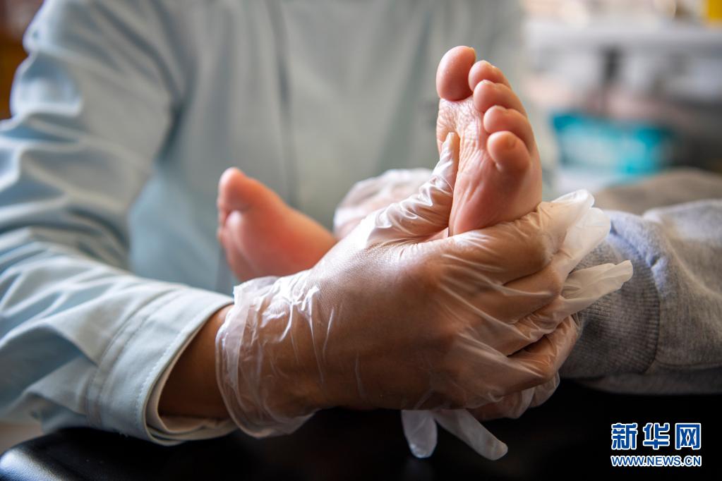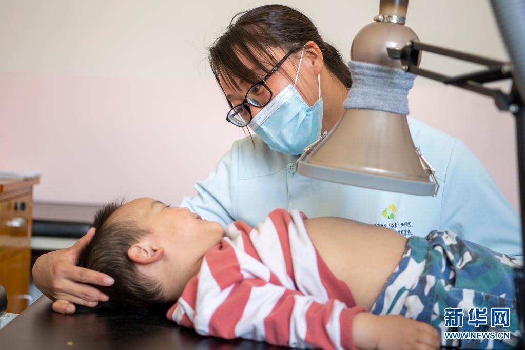 在山西太原市社会(儿童)福利院,党世英在为一名儿童做足底按摩(5月25日摄)。新华社记者 杨晨光 摄