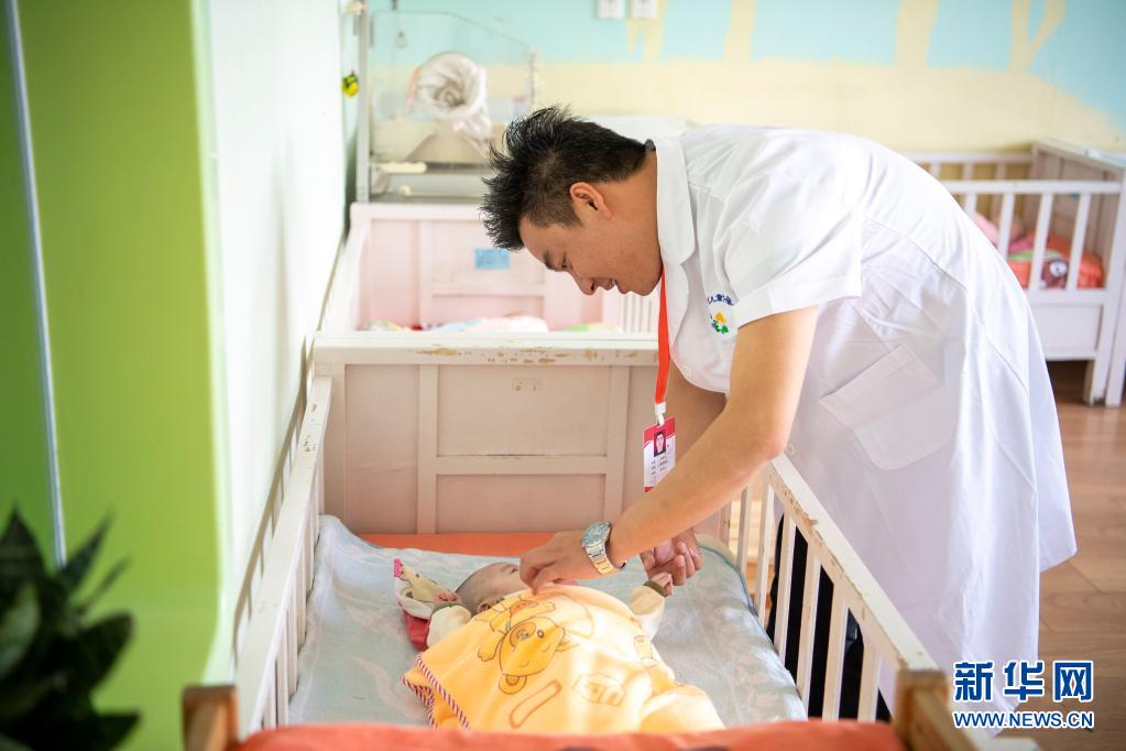 在山西太原市社会(儿童)福利院,今年33岁的党龙祥在照看一名婴儿(5月26日摄)。新华社记者 杨晨光 摄
