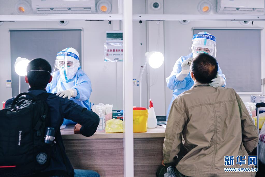 在上海浦东国际机场海关方舱,医护人员对入境旅客进行核酸采样(2020年5月18日摄)。新华社发(陈兴洲 摄)