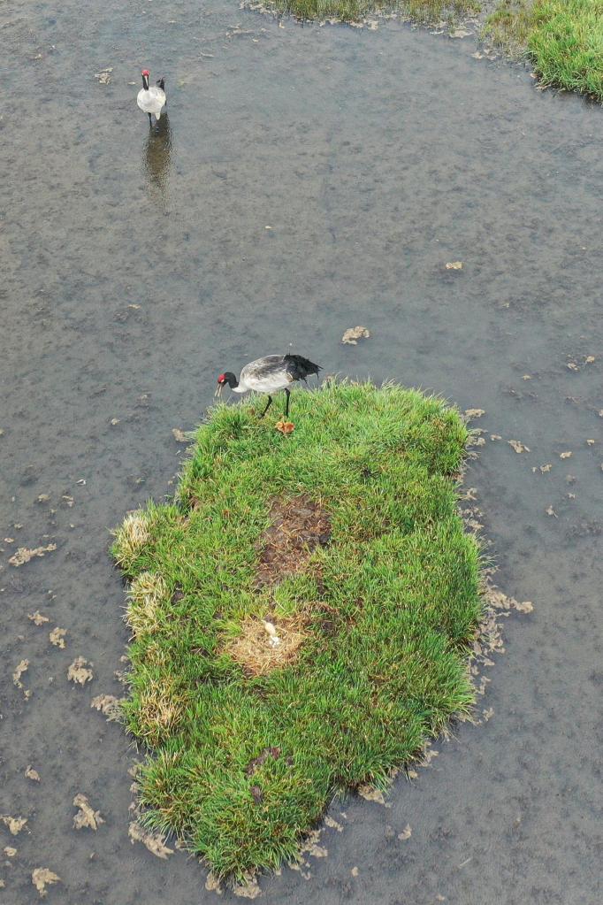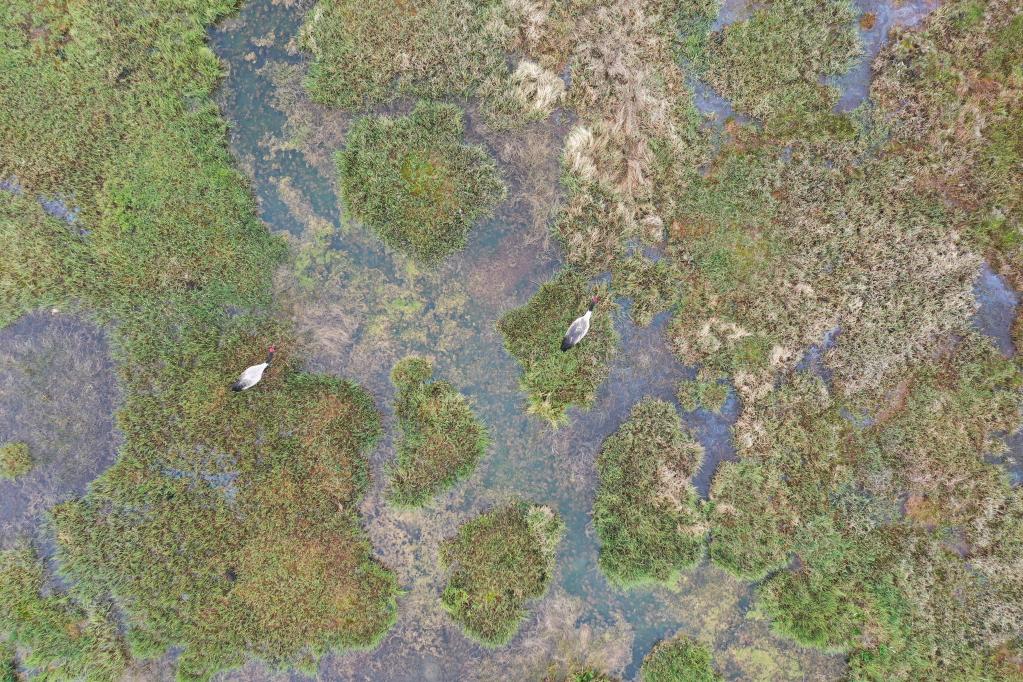 黑颈鹤在巢附近守护(无人机照片)。新华社记者杜哲宇 摄