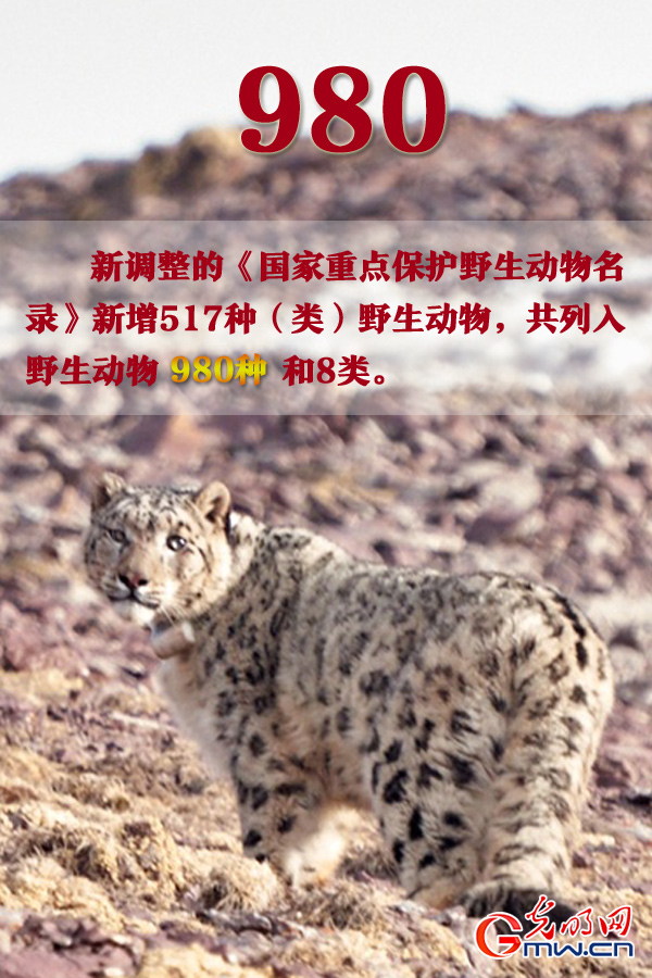 野生动物保护。新调整的《国家重点保护野生动物名录》新增517种(类)野生动物,共列入野生动物980种和8类。