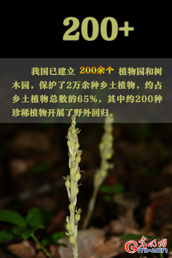 野生植物保护。我国已建立200余个植物园和树木园,保护了2万余种乡土植物,约占乡土植物总数的65%,其中约200种珍稀植物开展了野外回归。