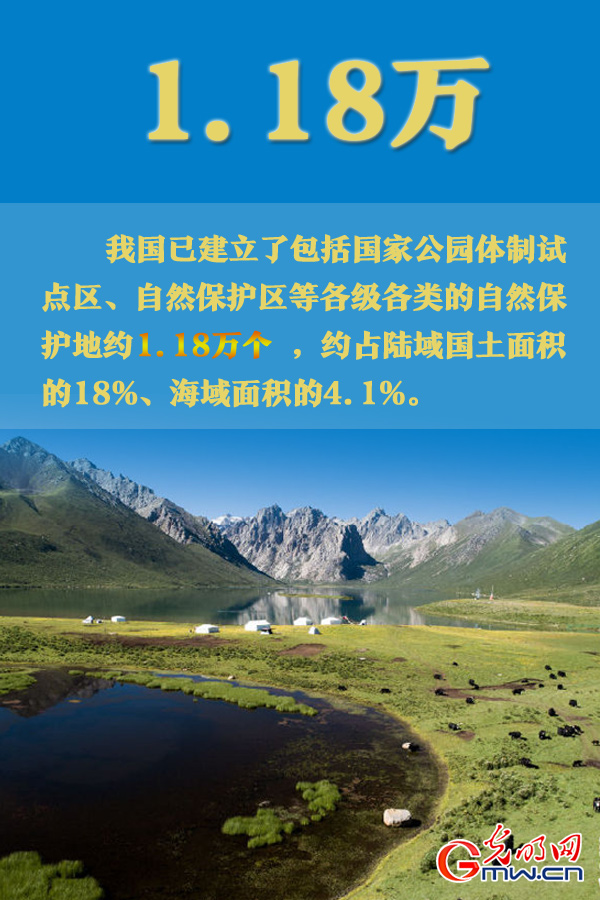 自然保护地。我国已建立了包括国家公园体制试点区、自然保护区等各级各类的自然保护地约1.18万个,约占陆域国土面积的18%、海域面积的4.1%。