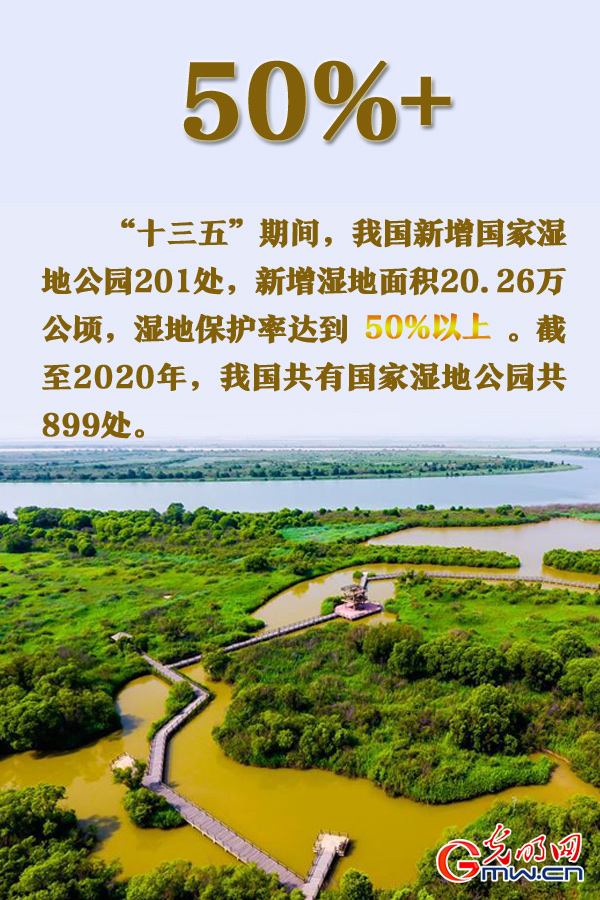 湿地保护。“十三五”期间,我国新增国家湿地公园201处,新增湿地面积20.26万公顷,湿地保护率达到50%以上。截至2020年,我国共有国家湿地公园共899处。