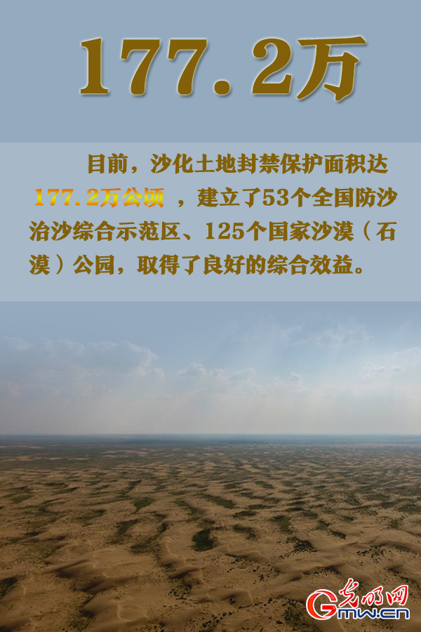 荒漠化防治。目前,沙化土地封禁保护面积达177.2万公顷,建立了53个全国防沙治沙综合示范区、125个国家沙漠(石漠)公园,取得了良好的综合效益。
