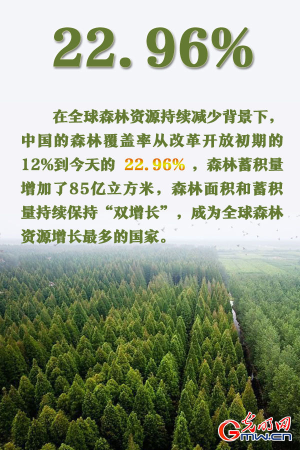 森林保护。在全球森林资源持续减少的背景下,中国的森林覆盖率从改革开放初期的12%到今天的22.96%,森林蓄积量增加了85亿立方米,森林面积和蓄积量持续保持“双增长”,成为全球森林资源增长最多的国家。