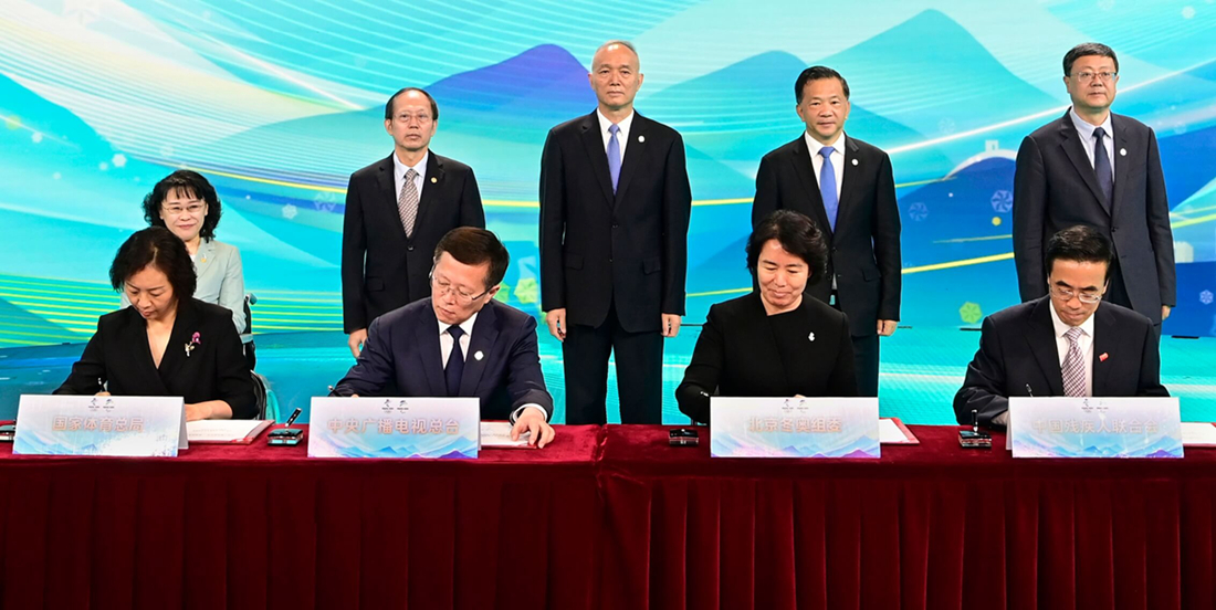 启动仪式上,蔡奇和慎海雄、陈吉宁、苟仲文、张海迪等共同见证了《中央广播电视总台北京2022年冬奥会和冬残奥会全媒体宣传合作协议》签署,并与运动员、志愿者和媒体代表一道,启动“冬奥来了”全媒体行动。