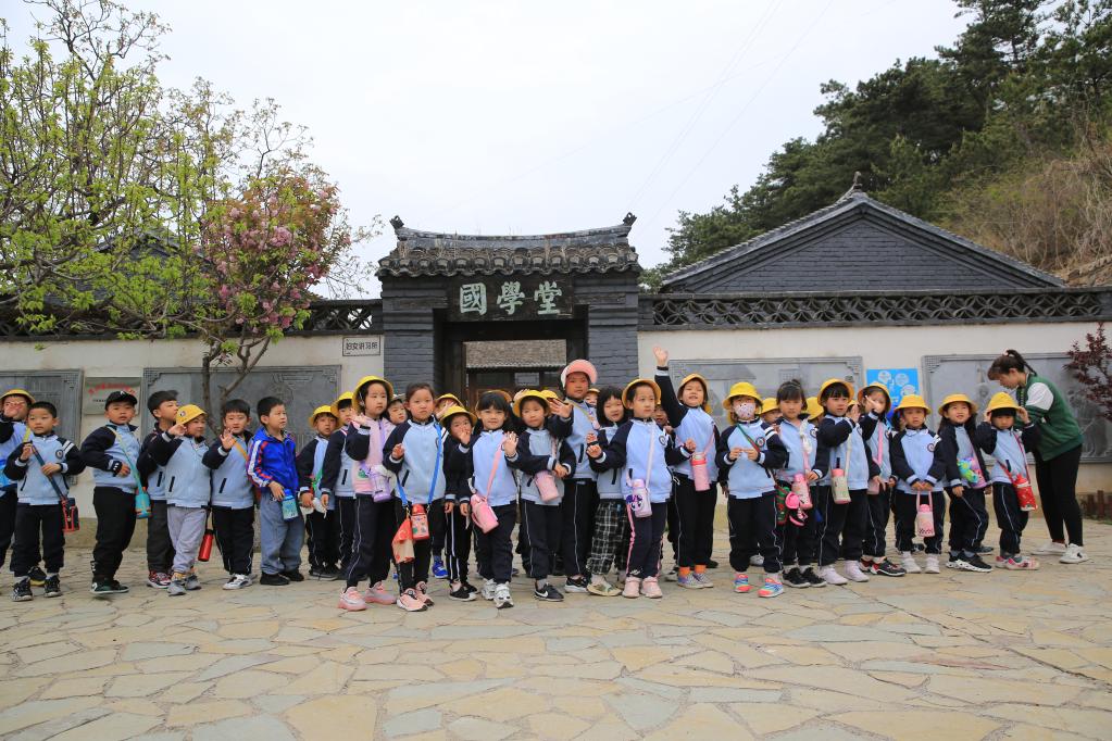 图为小朋友游客在唐山市迁西县马家沟村国学堂门前留影。(新华社记者高博摄)