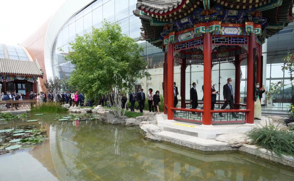 雕梁画栋、小桥流水、长廊水榭……在北京南部的大兴国际机场,指廊尽头的中国园处处彰显着中华文化的魅力。使节们漫步其中,不时按动快门记录建筑之美。