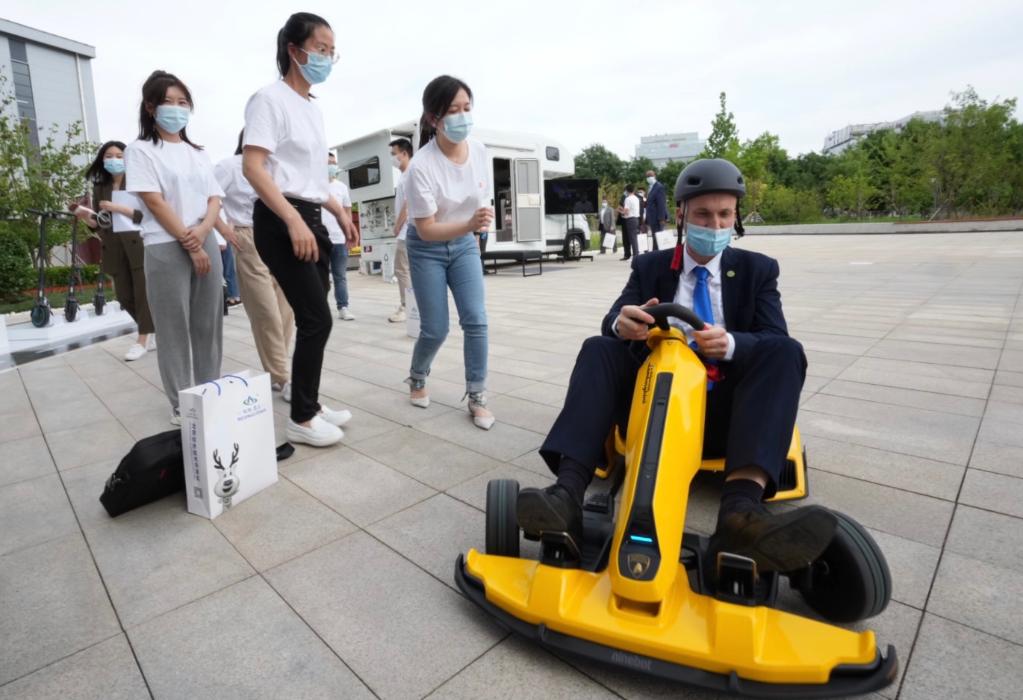 驻华使节在北京亦庄小米产业园内体验产品。
