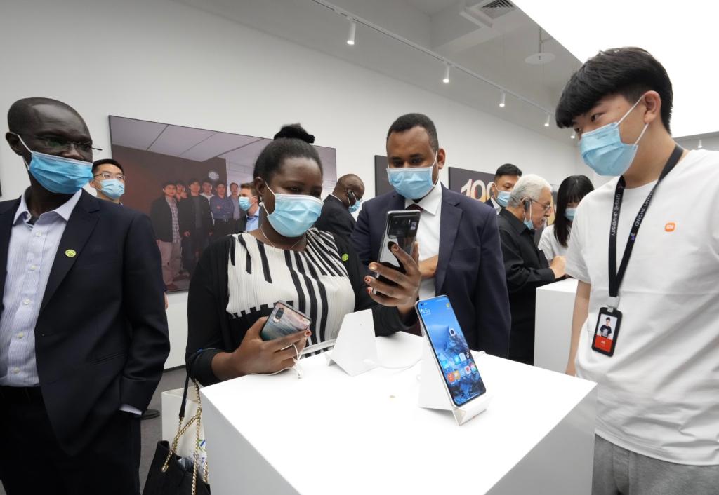 驻华使节在北京亦庄小米产业园内体验智能手机。