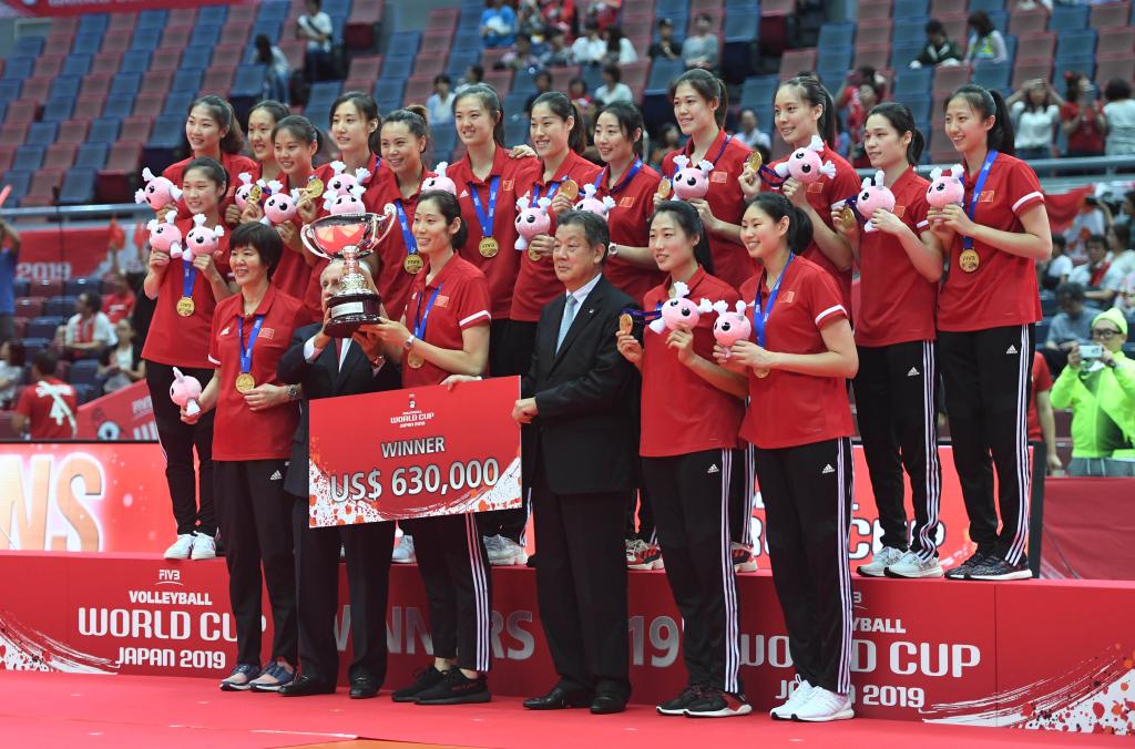 (图为2019年9月,中国队在女排世界杯上11连胜,最终捧得冠军奖杯)