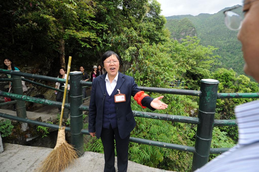 江满凤在景区为游客唱红歌。新华社记者 余刚 摄
