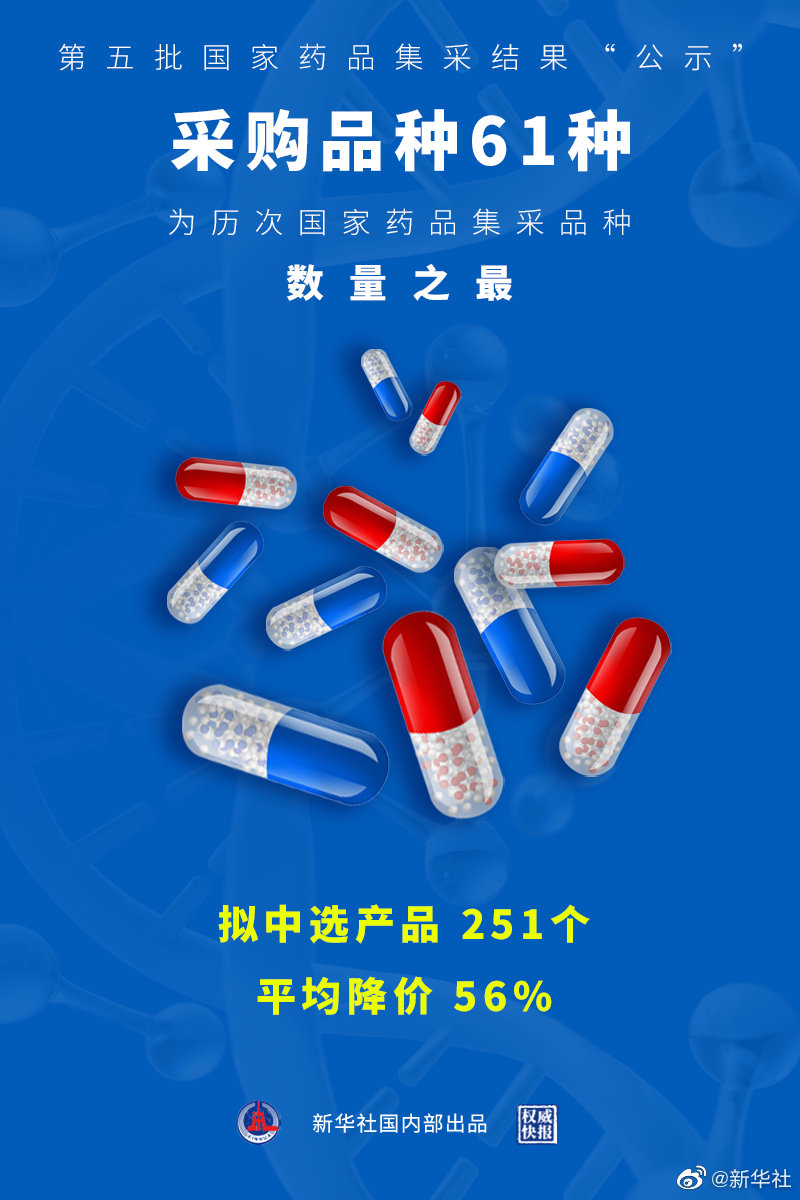 国家再次“团购”药品,实现以量换价。第五批国家药品集采拟中选产品251个,药品品种达到61种,为历次国家药品集采品种数量最多的一次,拟中选药品平均降价56%。此次集采品种覆盖高血压、冠心病、糖尿病、抗过敏、抗感染、消化道疾病等常见病、慢性病用药。(记者彭韵佳、龚雯;海报设计:张晨光)