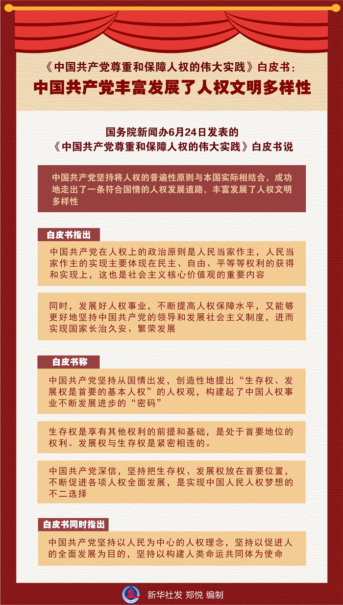 新华社北京6月24日电 国务院新闻办24日发表的《中国共产党尊重和保障人权的伟大实践》白皮书说,中国共产党坚持将人权的普遍性原则与本国实际相结合,成功地走出了一条符合国情的人权发展道路,丰富发展了人权文明多样性。