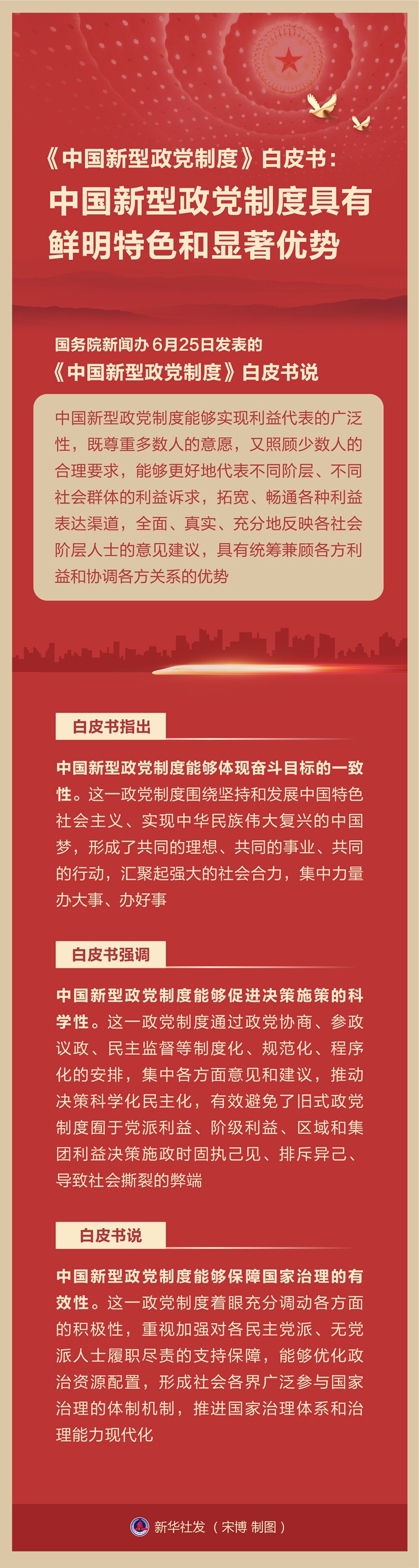 新华社北京6月25日电 国务院新闻办25日发表的《中国新型政党制度》白皮书说,中国新型政党制度能够实现利益代表的广泛性,既尊重多数人的意愿,又照顾少数人的合理要求,能够更好地代表不同阶层、不同社会群体的利益诉求,拓宽、畅通各种利益表达渠道,全面、真实、充分地反映各社会阶层人士的意见建议,具有统筹兼顾各方利益和协调各方关系的优势。