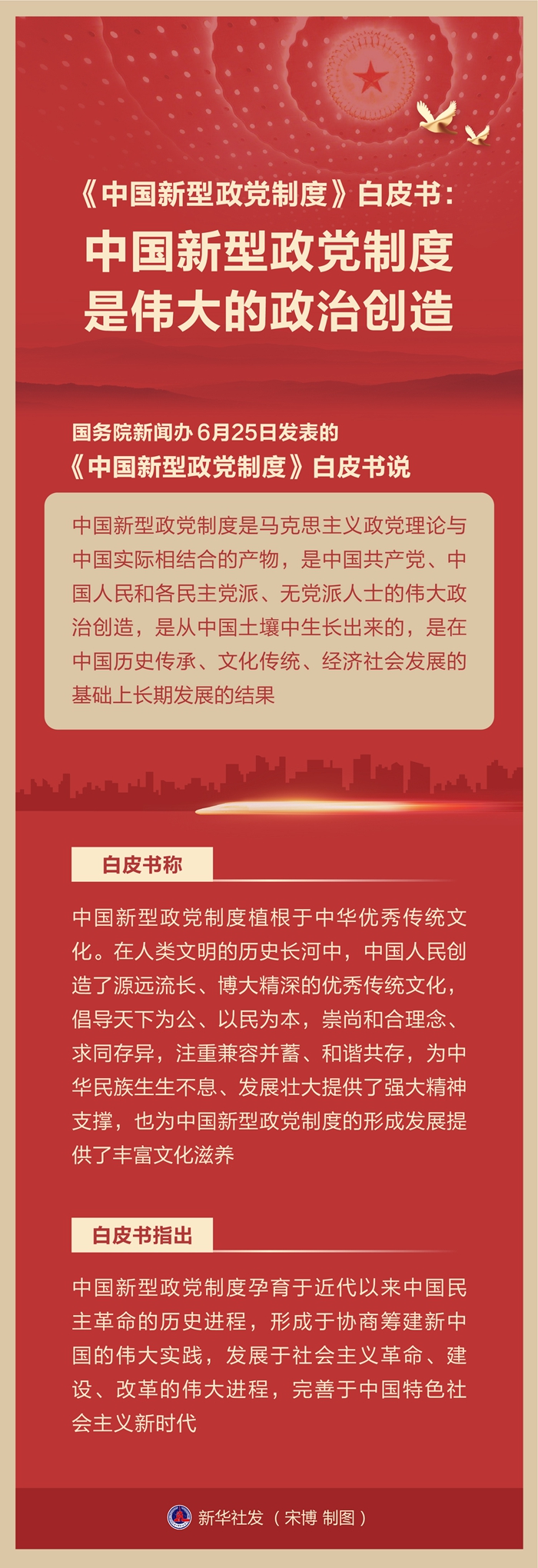新华社北京6月25日电 国务院新闻办25日发表的《中国新型政党制度》白皮书说,中国新型政党制度是马克思主义政党理论与中国实际相结合的产物,是中国共产党、中国人民和各民主党派、无党派人士的伟大政治创造,是从中国土壤中生长出来的,是在中国历史传承、文化传统、经济社会发展的基础上长期发展的结果。