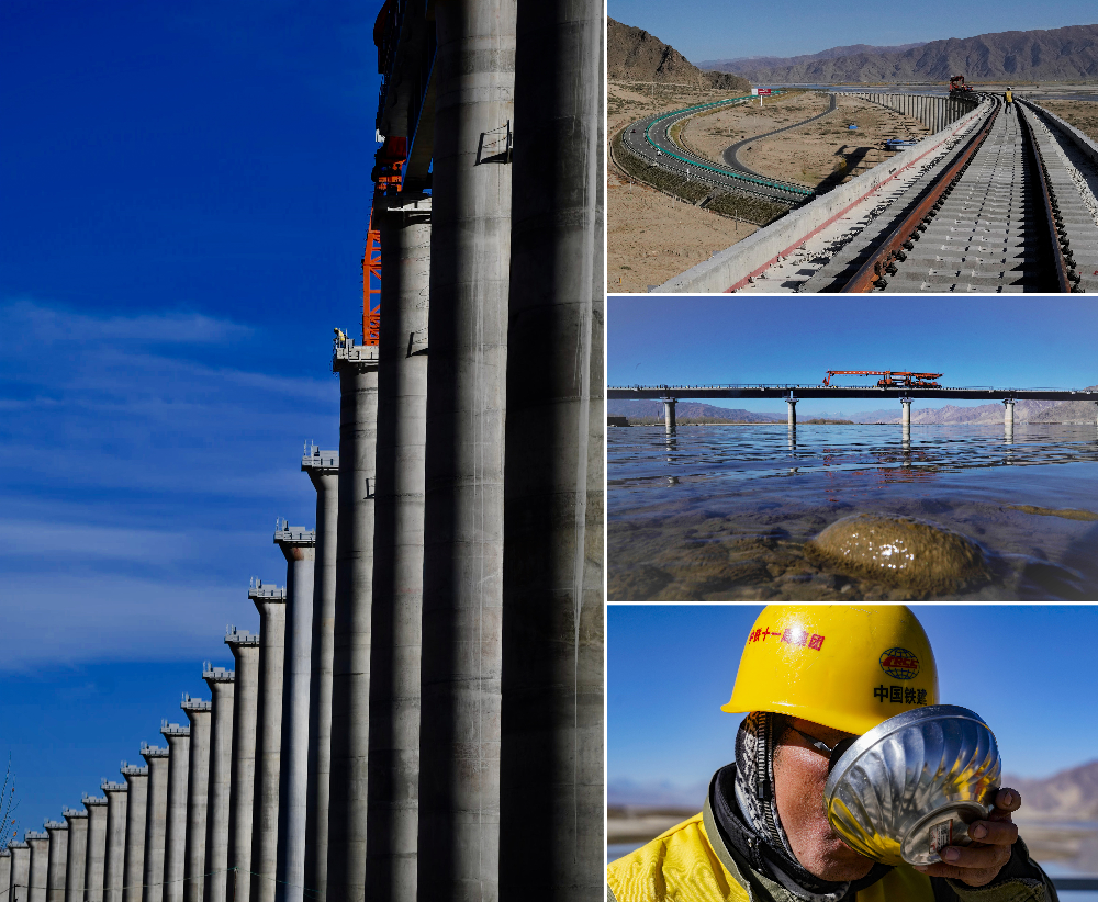 这是一张拼版资料照片,左图为:中铁十一局工人在拉林铁路昌果特大桥进行铺轨作业(2018年10月16日摄);右上图为:建设中的拉林铁路(2018年10月16日摄)。右中图为:施工人员在拉林铁路贡嘎雅鲁藏布江特大桥上铺轨(2018年11月26日摄);右下图为:一名施工人员在拉林铁路贡嘎雅鲁藏布江特大桥施工现场吃午饭(2018年11月26日)。 新华社记者 普布扎西 摄