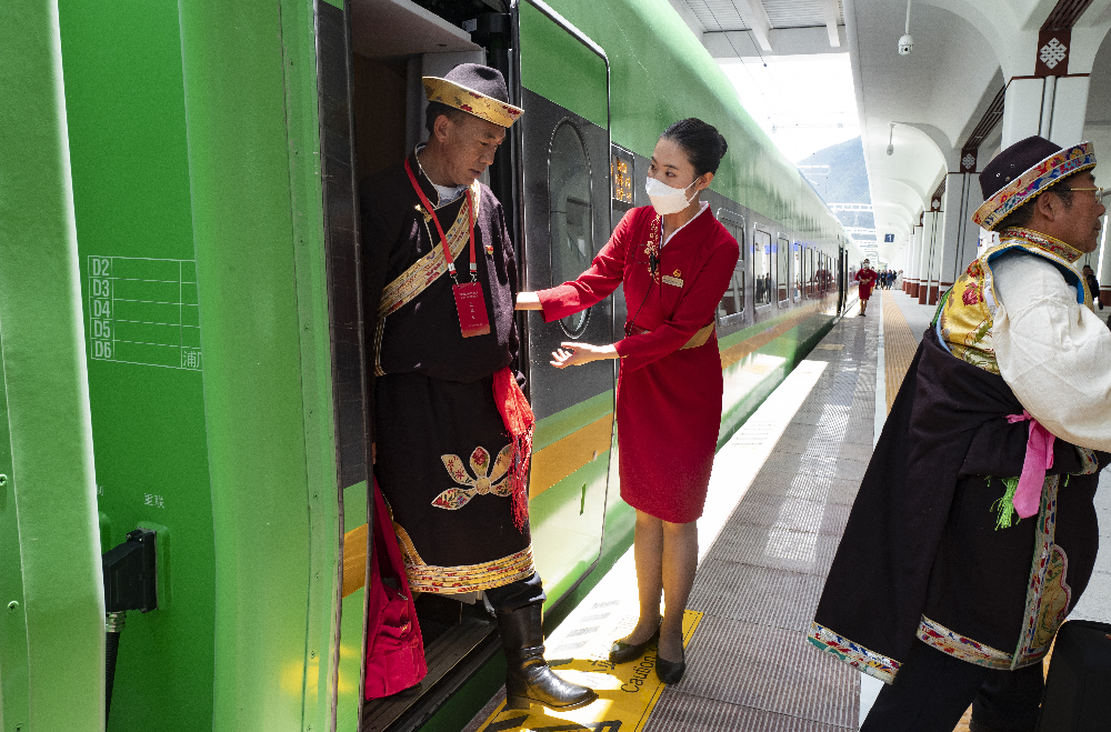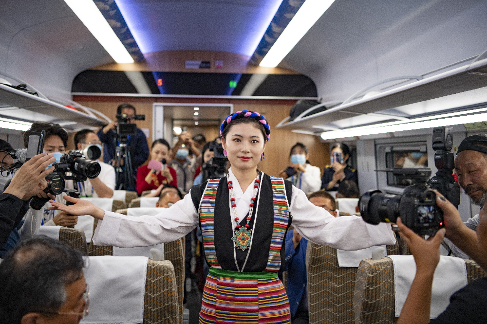 西藏首列复兴号的列车员在进行当地服饰表演(6月25日摄)。 新华社记者 普布扎西 摄