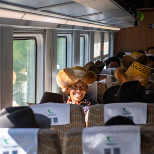 来自山南市贡嘎县杰德秀镇杰德秀村的巴珠,今年68岁,他一会儿从车窗眼望高山峡谷,一会儿摸摸车内现代化设施,这是他头一次坐火车。“复兴号和牛车比起来,像是在飞翔。”他笑着说。